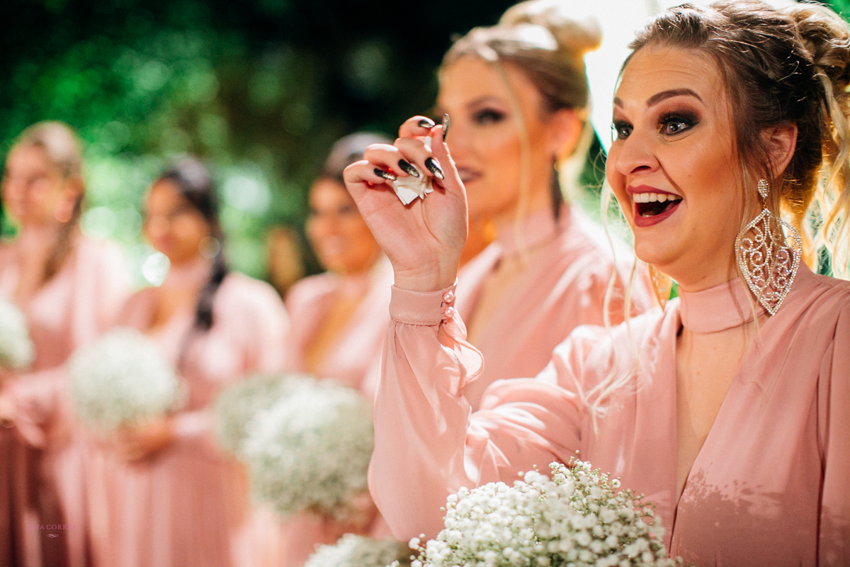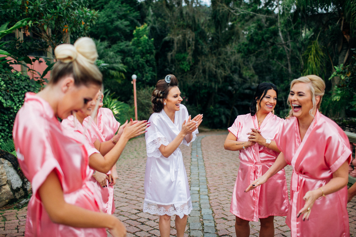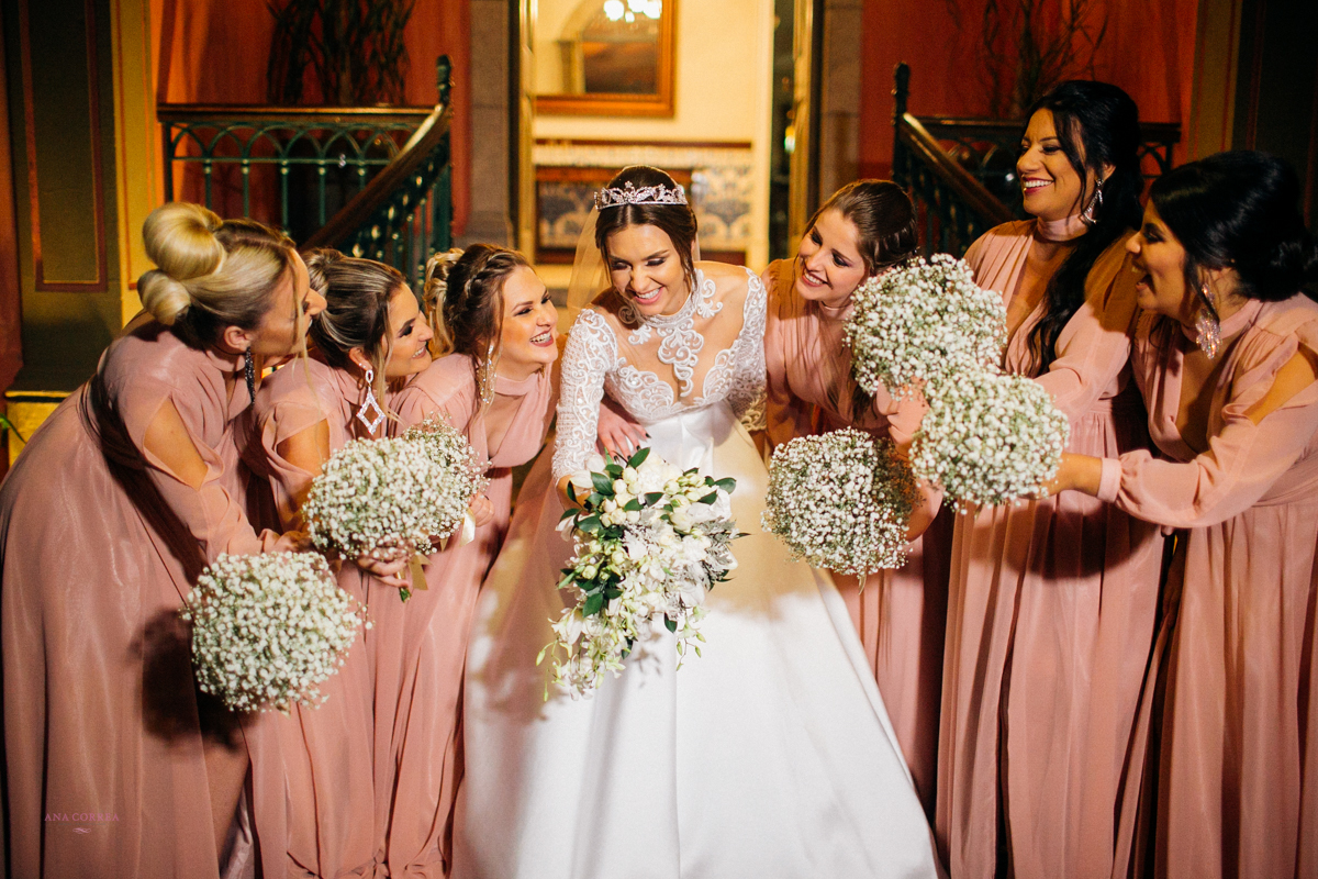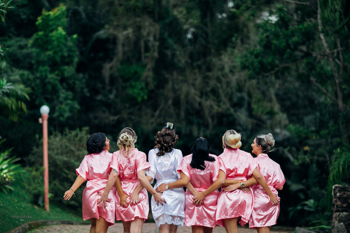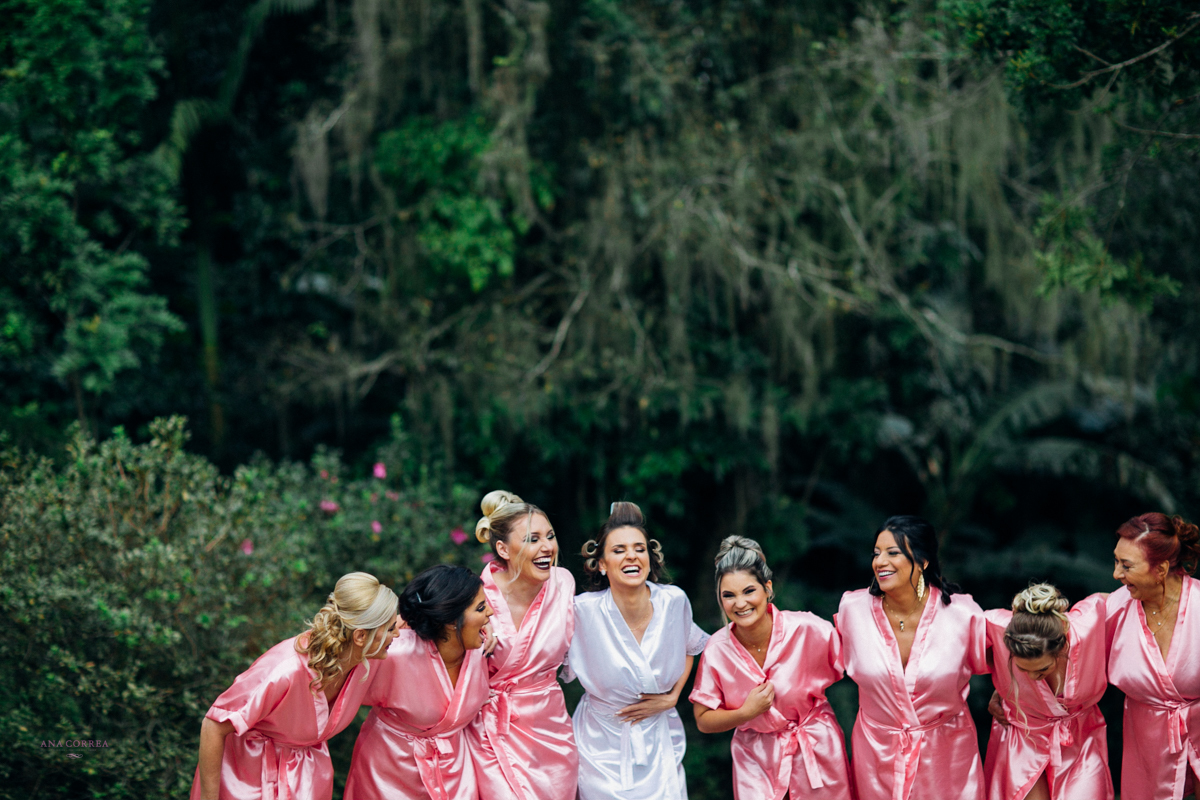 noiva recebendo buquê de rosas do noivo e madrinhas ao lado no making of clicado por Ana Correa   fotógrafa de casamento e destination wedding de Florianópolis SC numa linda cena