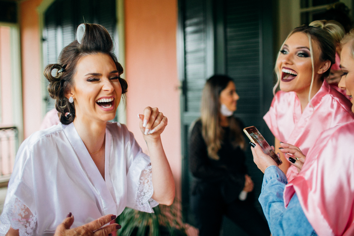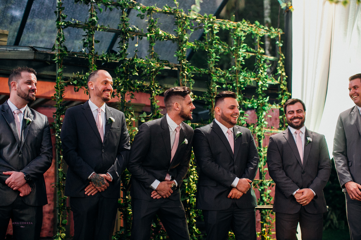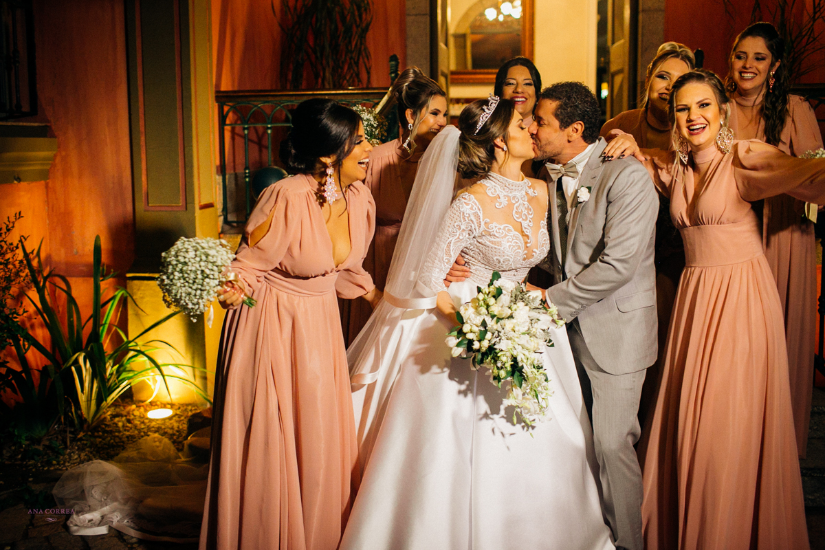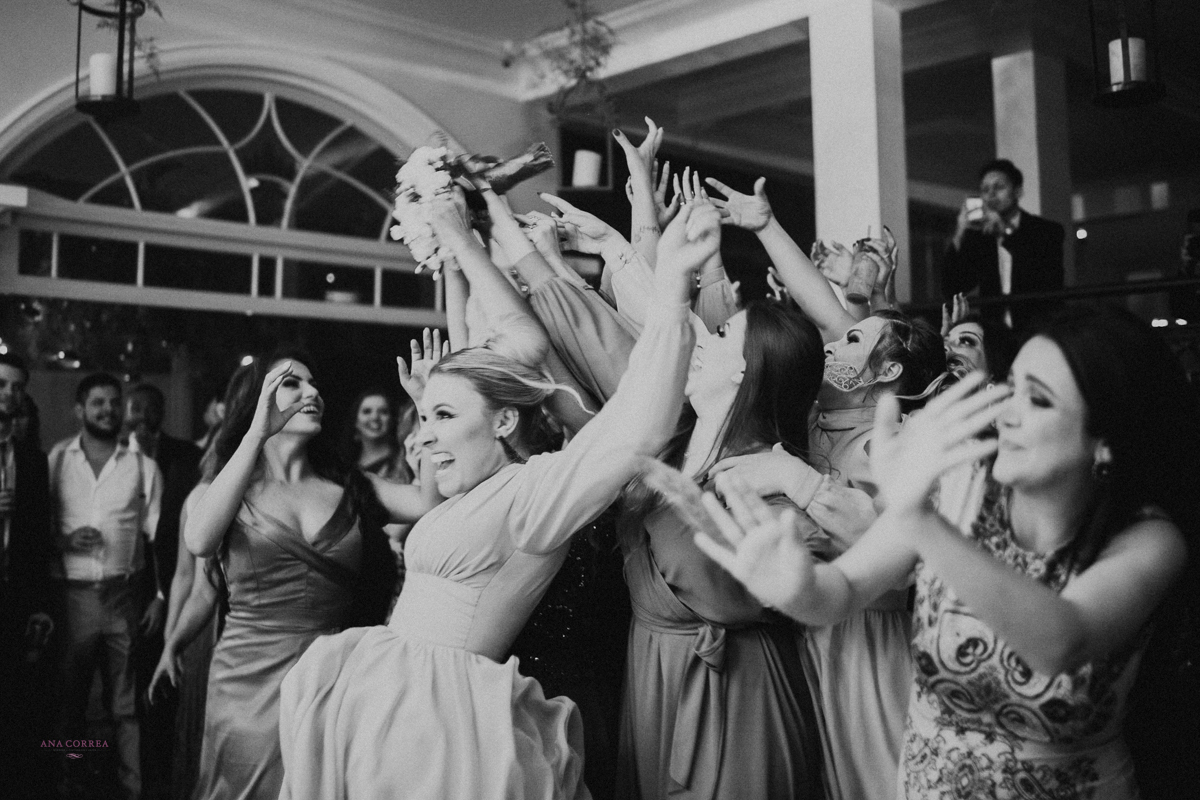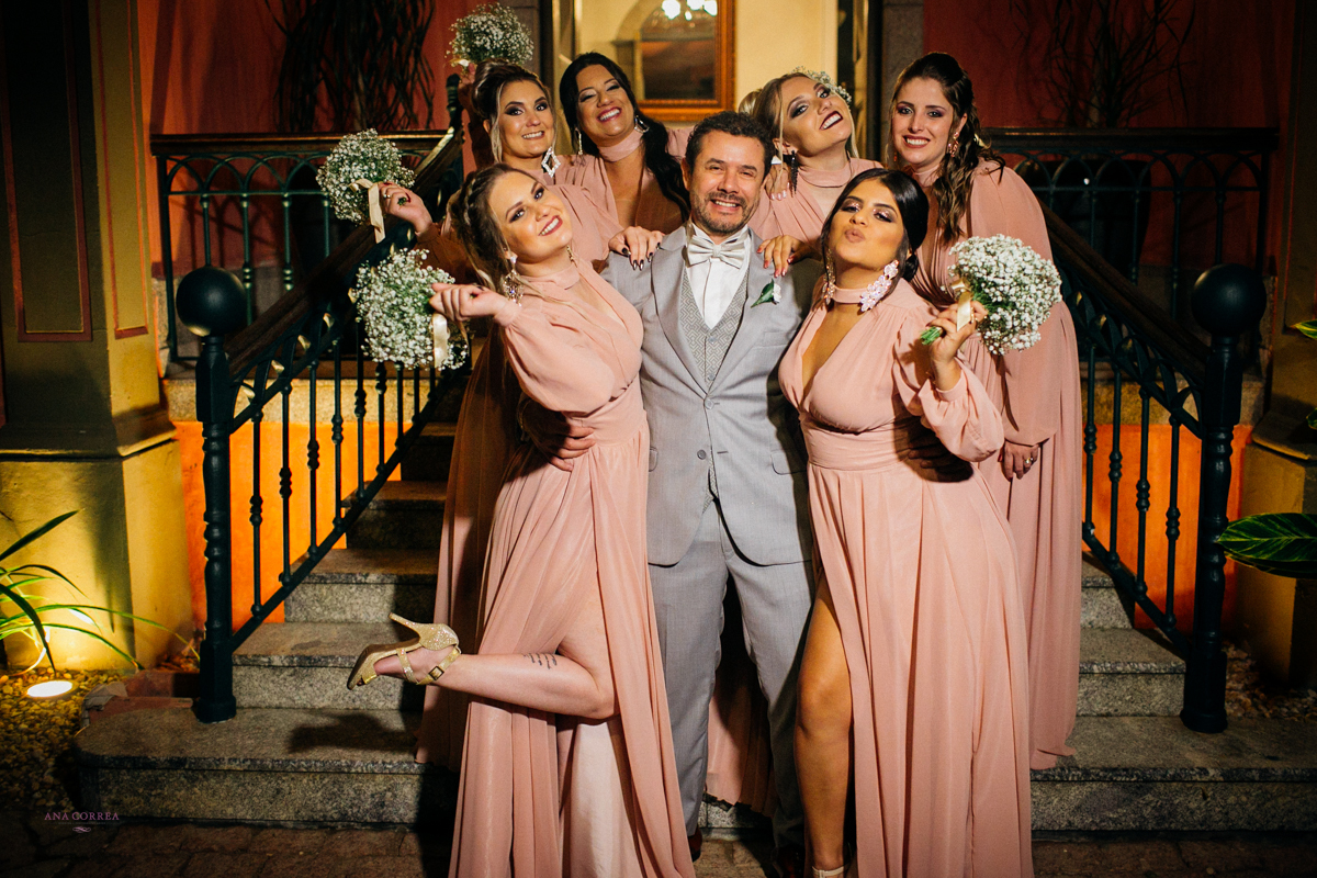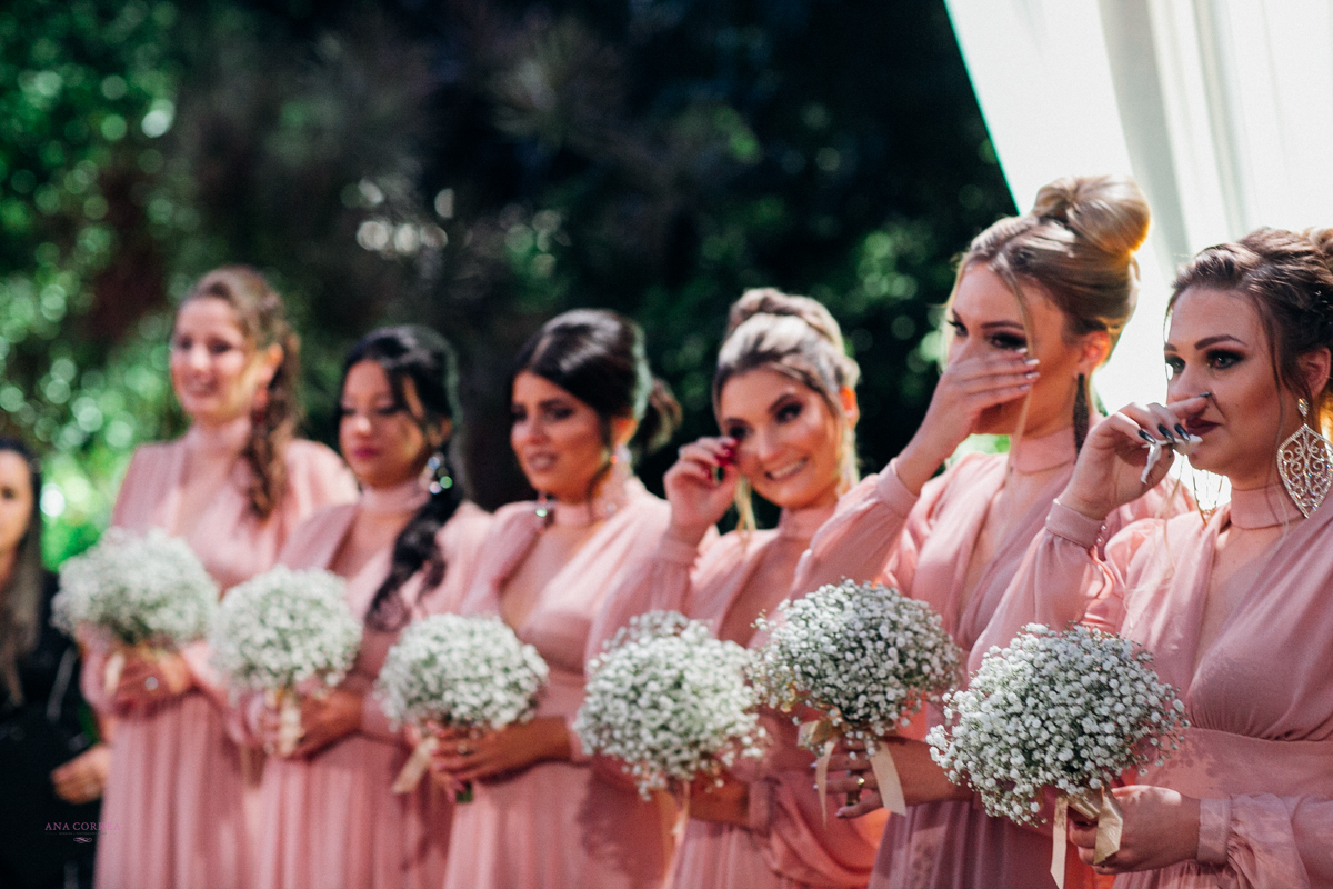 noiva recebendo buquê de rosas do noivo e madrinhas ao lado no making of clicado por Ana Correa   fotógrafa de casamento e destination wedding de Florianópolis SC numa linda cena